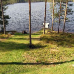 Mökiltä rantaan johtaa nurmikkoinen rinne, jossa on matkalla portaat. Piha on loivahko, ja siinä on hyvä pelata pihapelejä. Yläpihalta löytyy grillikatos. Marjamaasto alkaa aivan mökin vierestä. Hiekkaranta, laituri ja vene. Lähin naapuri 0,1km.